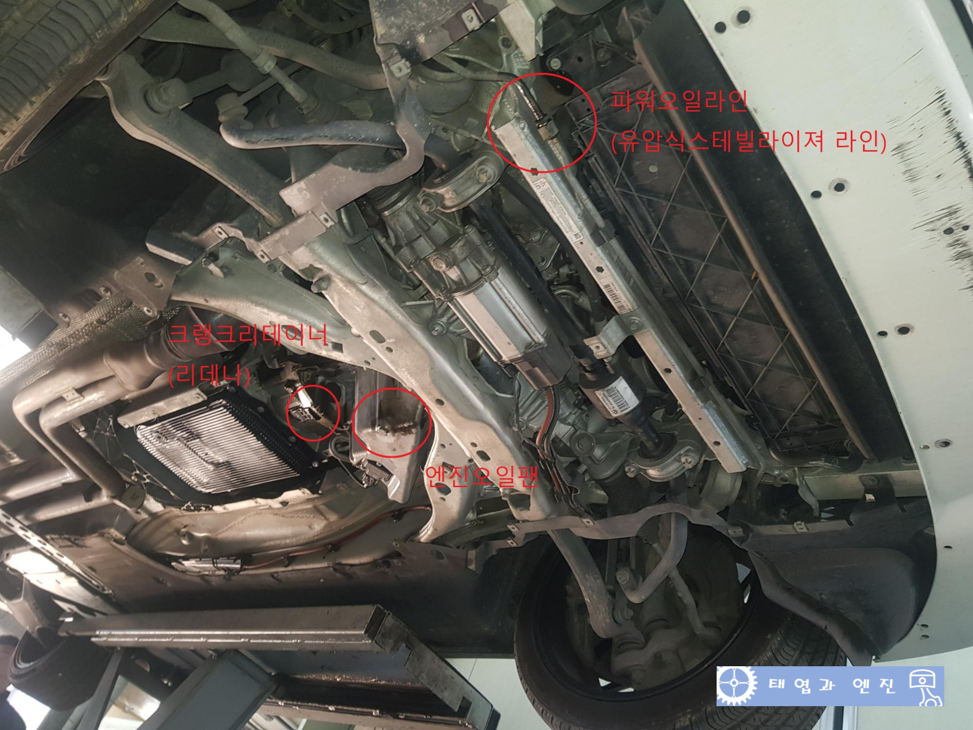 F10 가솔린 모델에서 가장 빈번한 누유 지점은 오일쿨러 주변이다.