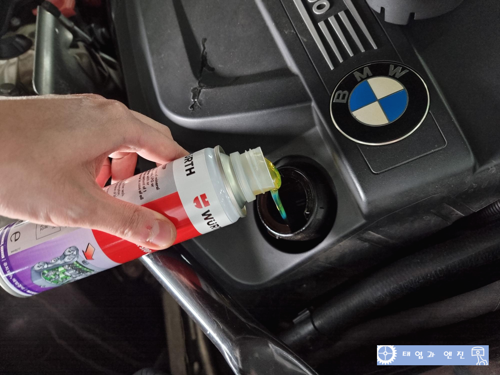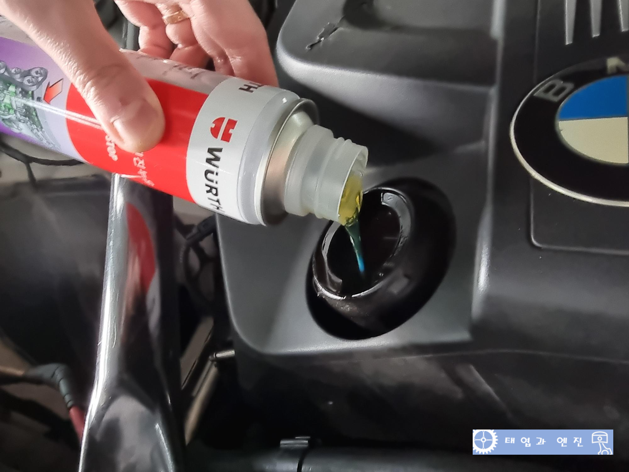 오일 캡을 반시계 방향으로 열고 잘 흔든 첨가제를 흘리지 않게 투입해준다. 색상은 황금빛으로 엔진오일 색상과 유사하다.