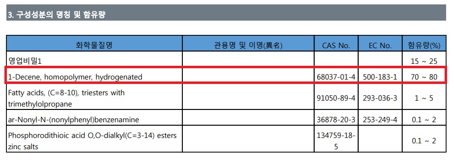 위 MSDS자료는 Kixx PAO1 제품으로, 4등급 기유인 PAO(Poly Alpha Olefin, 올레핀폴리머) 함유량이 70~80%를 차지한다. 가성비로 유명한 제품이다.