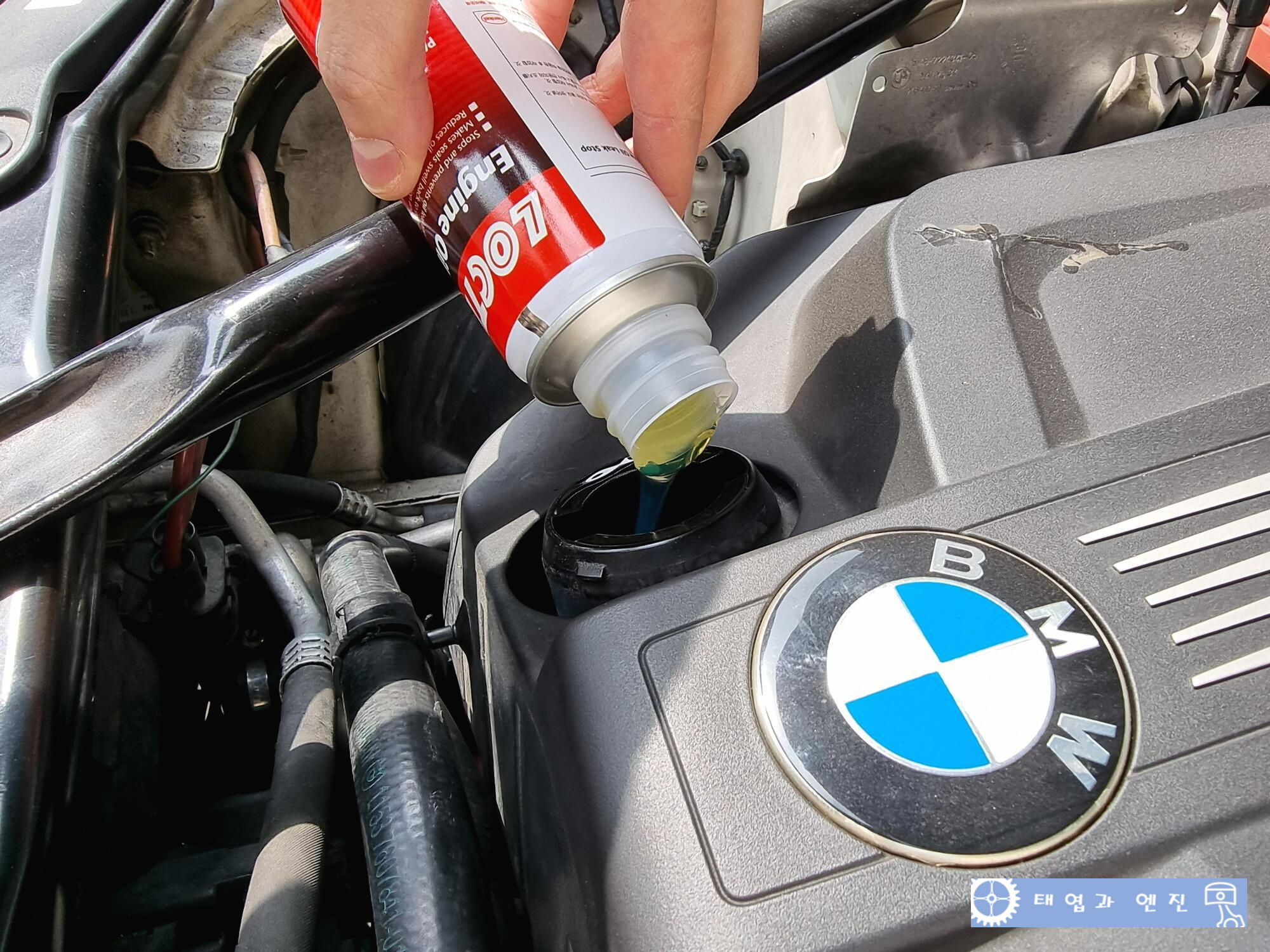 오일 캡을 반시계 방향으로 열고 잘 흔든 첨가제를 흘리지 않게 투입해준다. 색상은 황금빛으로 엔진오일 색상과 유사하다.