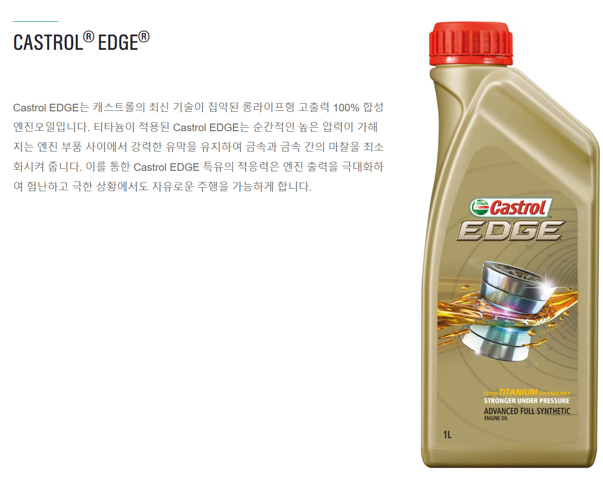 Castrol EDGE 제품은 그룹3 VHVI 합성유에 해당하지만, FST(Titanuim Fluid Strength Technology)라는 독보적인 유막강화 기술이 적용된 특징 있는 제품이다.