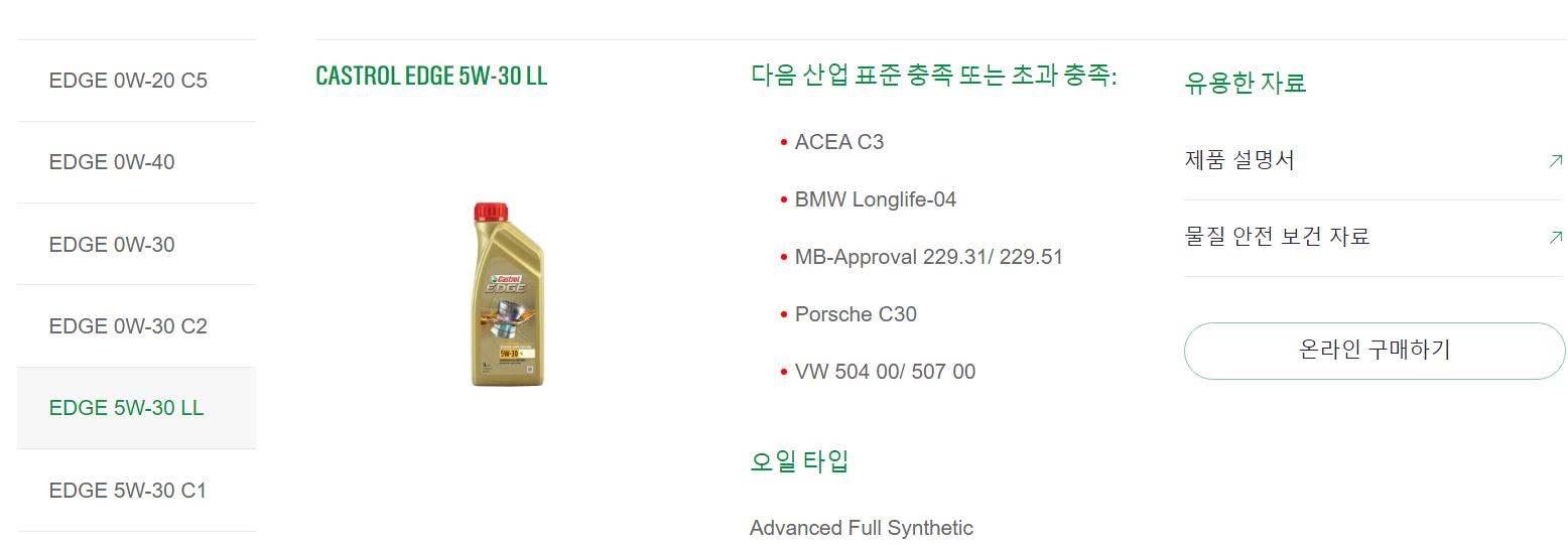 엔진오일 5W30 LL 그룹3 합성유 캐스트롤 앳지 롱라이프 Castrol EDGE LL Longlife 브리티시 페트롤리엄 Brithish Petroleum BP