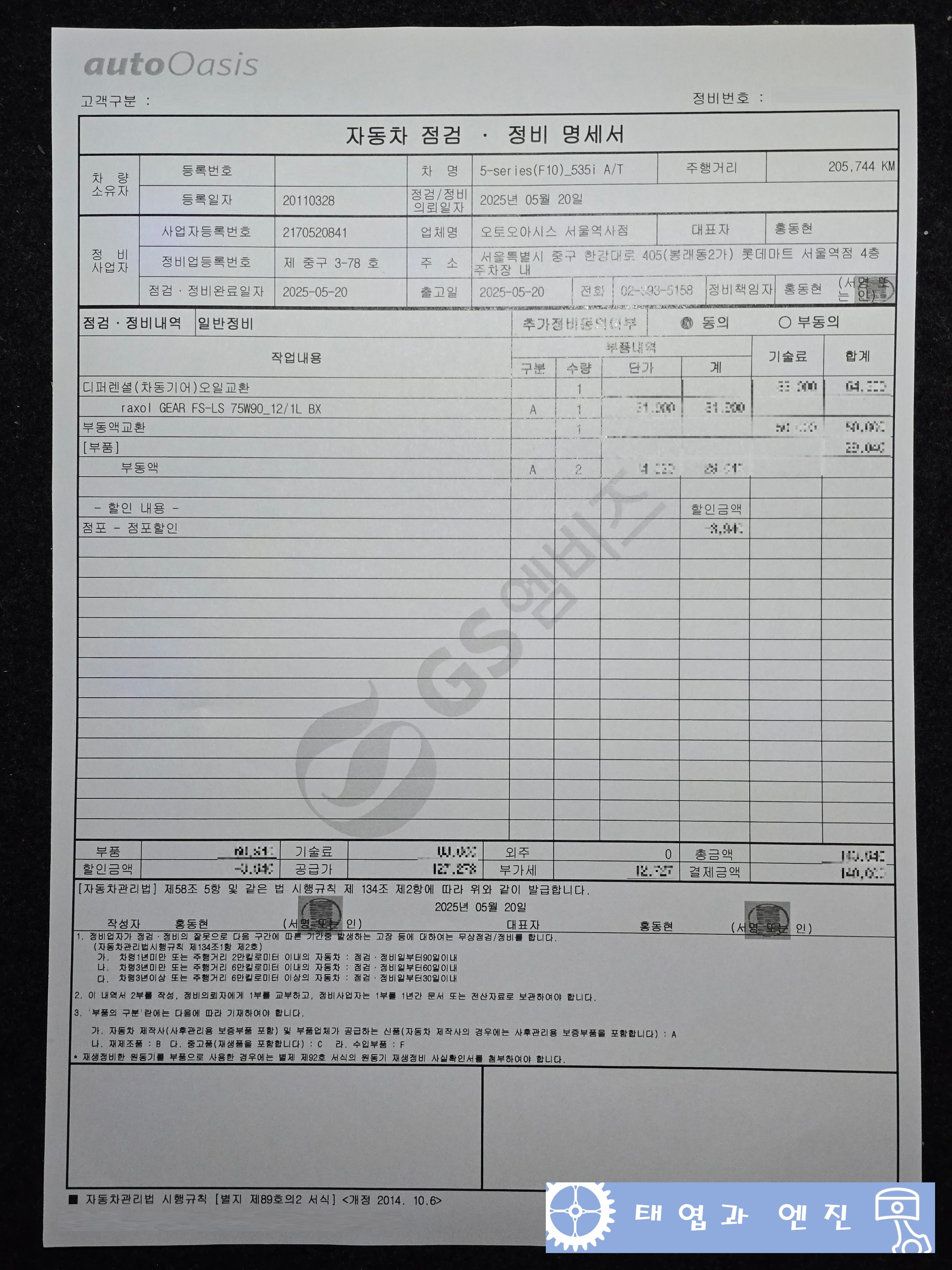 오토오아시스 서울역사점은 다양한 브랜드의 수입차를 20년 이상 다루셨다고 하니 그 실력과 내공에는 의심의 여지가 없다. 흔하지 않은 535i 차량에서 자주 고장 나는 부분이나 더 잘 관리해야 하는 소모품 등을 잘 알고 계셨기 때문이었다.