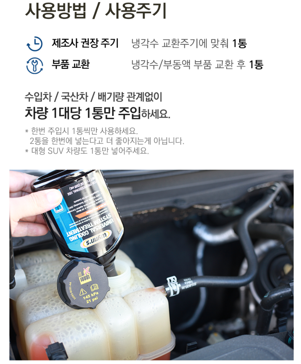시공법은 특별히 어렵지 않다. 보통의 냉각수 첨가제와 동일한 사용법이다.