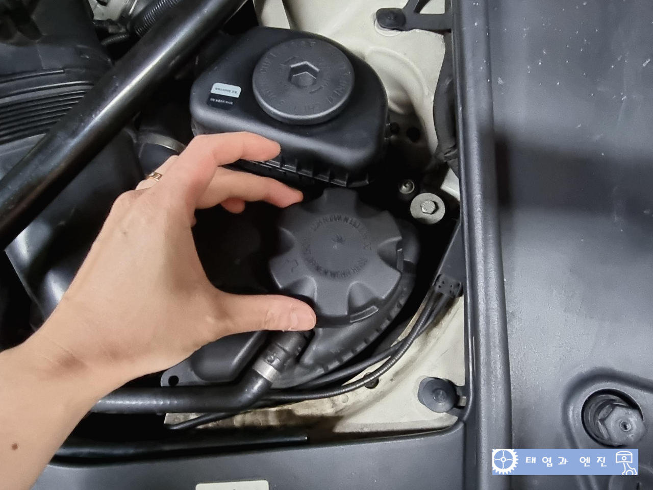 F10 535i의 냉각수 보조탱크는 운전석 측 앞쪽에 위치하고 있다.